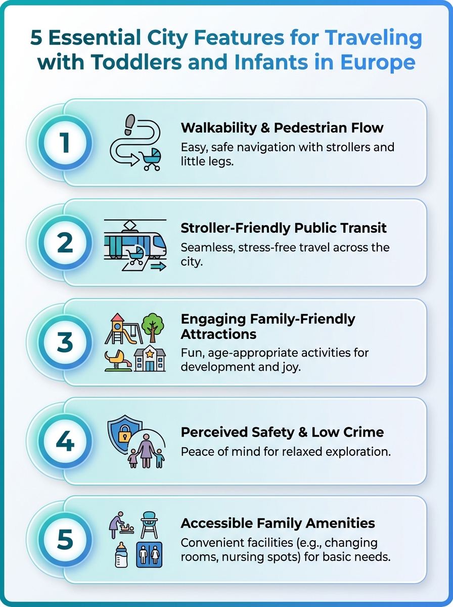 Explore five essential city features that make Europe travel with toddlers and infants easier. This infographic highlights accessibility, safety, kid-friendly activities, amenities, and transport ease.