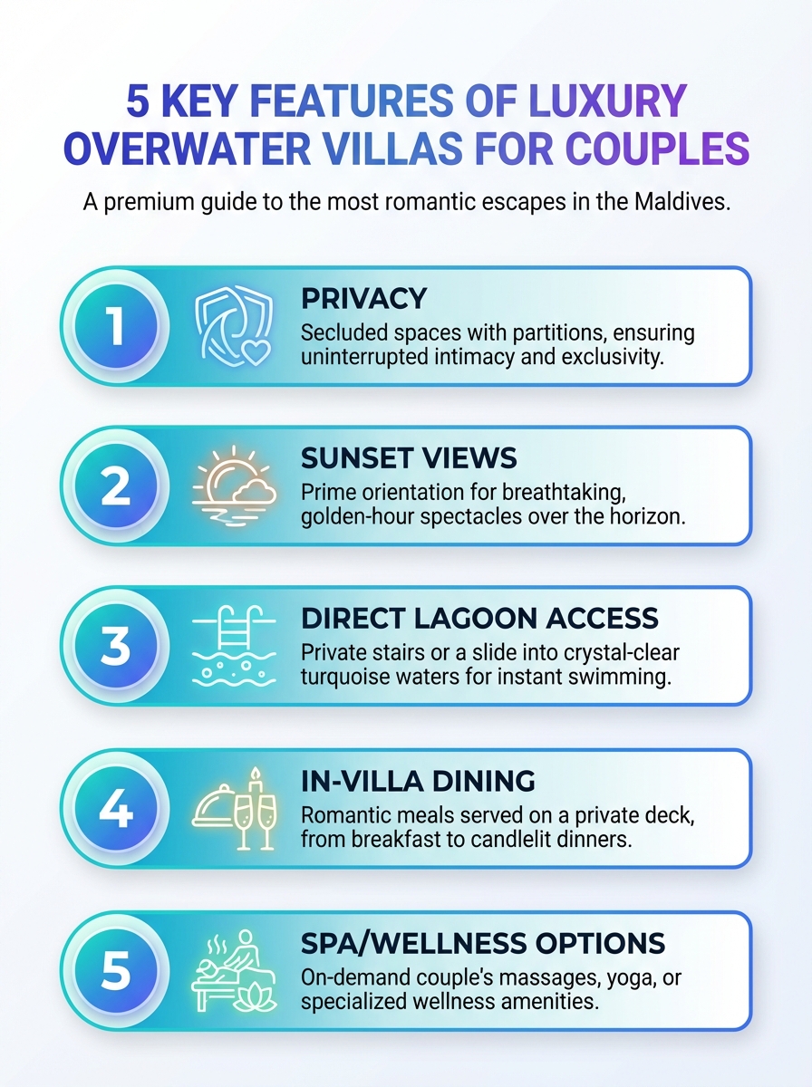 Discover the five standout features of luxury overwater villas in the Maldives for couples. From private decks to sunset dining, this infographic guides romantic escapes.