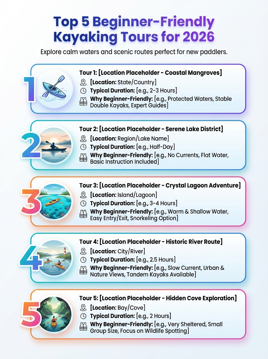 This infographic ranks the top beginner-friendly kayak tours for 2026. Use it to compare options and plan your first paddling adventure.