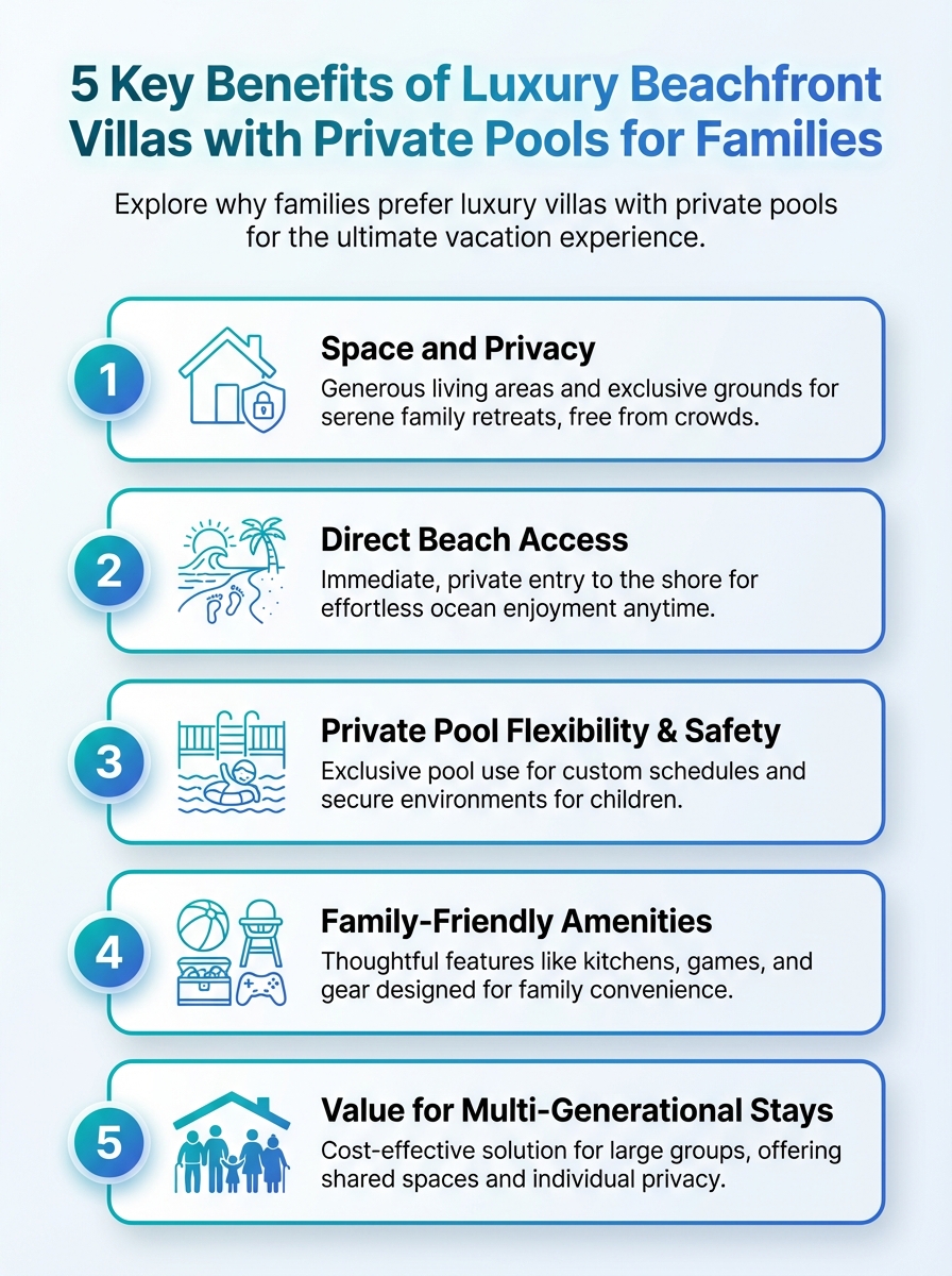 This infographic highlights five key benefits of choosing luxury beachfront villas with private pools for family vacations. It covers space, privacy, safety, convenience, and resort-style amenities.