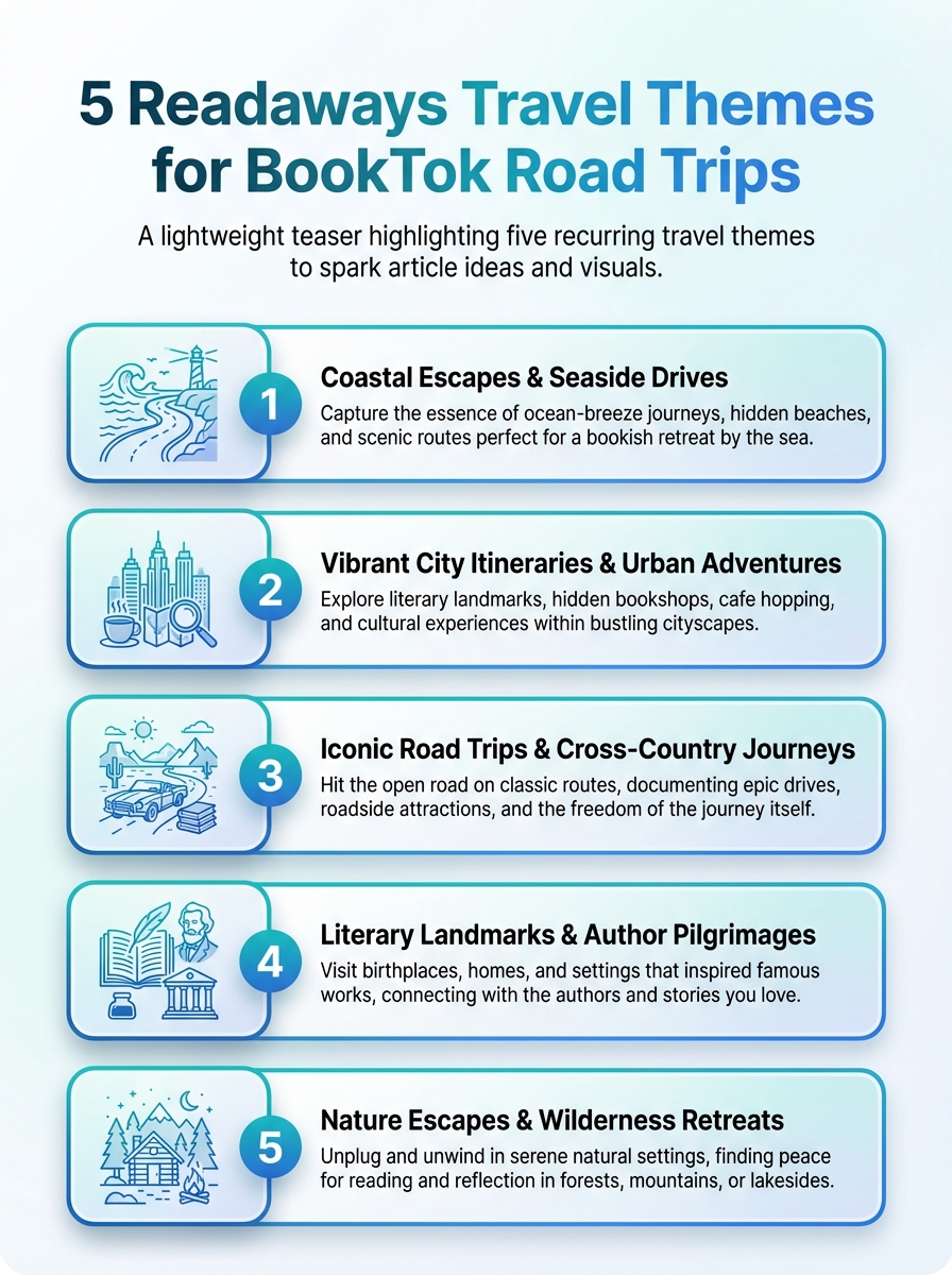 Discover five Readaways travel themes for BookTok road trips. This infographic highlights ideas to spark your next literary road-trip itinerary.