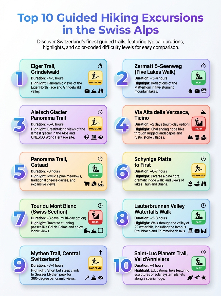 A concise visual guide to the top guided hikes in the Swiss Alps, outlining key routes, durations, and highlights.