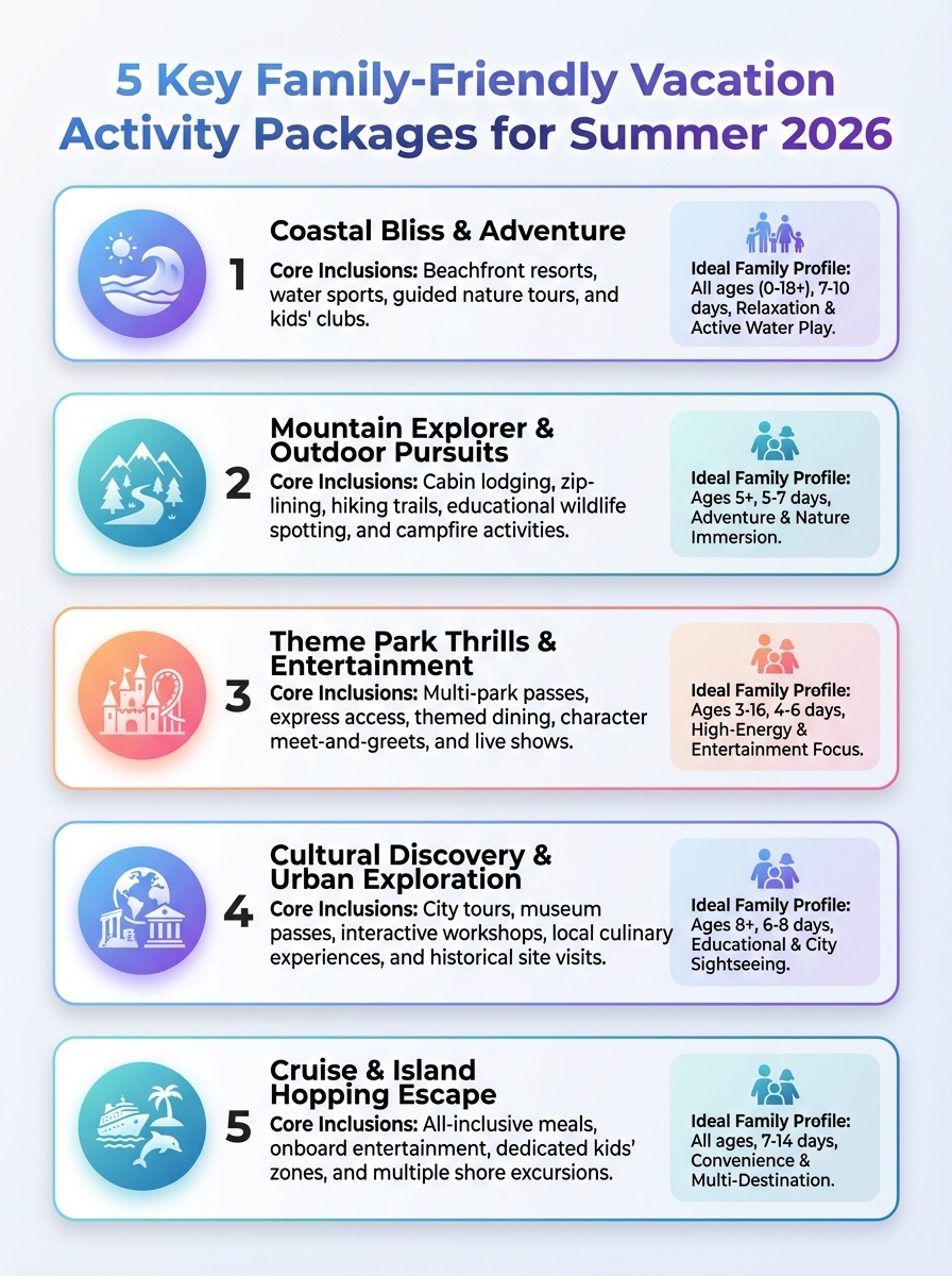 Five key family-friendly vacation activity packages for Summer 2026. Plan a memorable summer break for all ages.