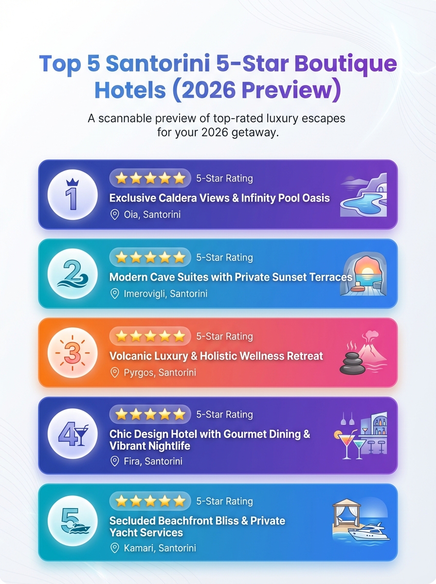 A concise visual ranking of Santorini’s top 5 five-star boutique hotels for 2026. Includes highlights on luxury features and guest ratings to help find your stay.